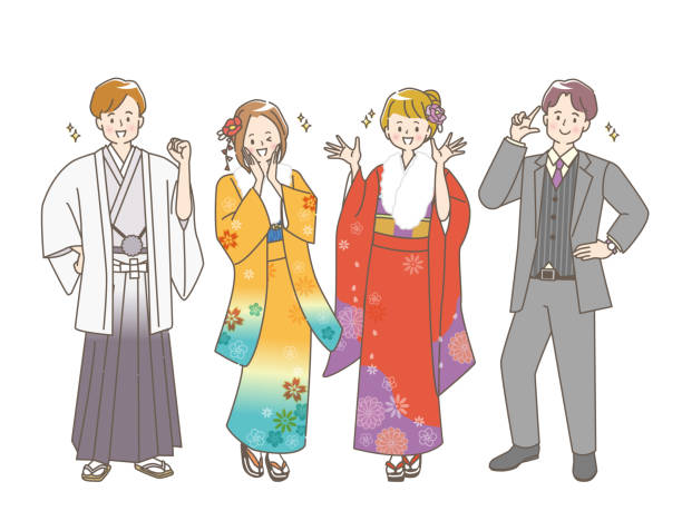 Illustration set of men and women in hanging scrolls and sunny clothes